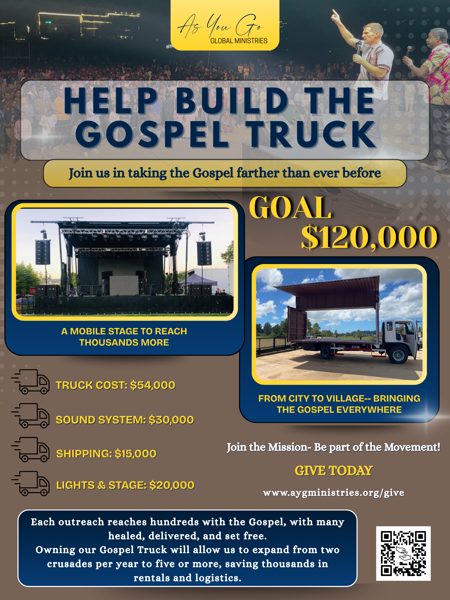 A gospel truck will be a crusade stage on wheels, the truck will have to be custom built and will be fitted with a sound system, lights, and enough space for the worship team and evangelists.